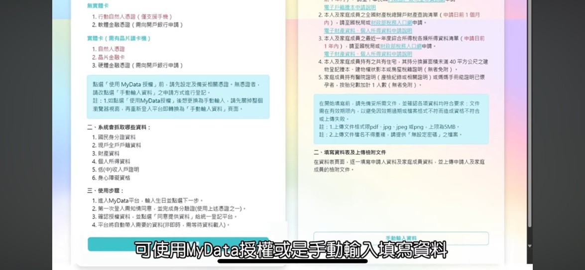(三)個人資料授權:由系爭平台跳轉到「個人化資料自主運用(MyData)官方授權頁面」,並顯示系統會獲取申請人及其家庭成員之相關個人資料(身分證資料、全戶戶籍資料、財產資料等),於授權完成後,系統將自動帶入檢附文件。